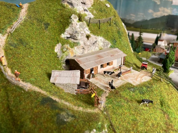 Die Gebäude der Alpwirtschaft sind Eigenbauten aus Karton mit selbst eingearbeiteten Prägungen.